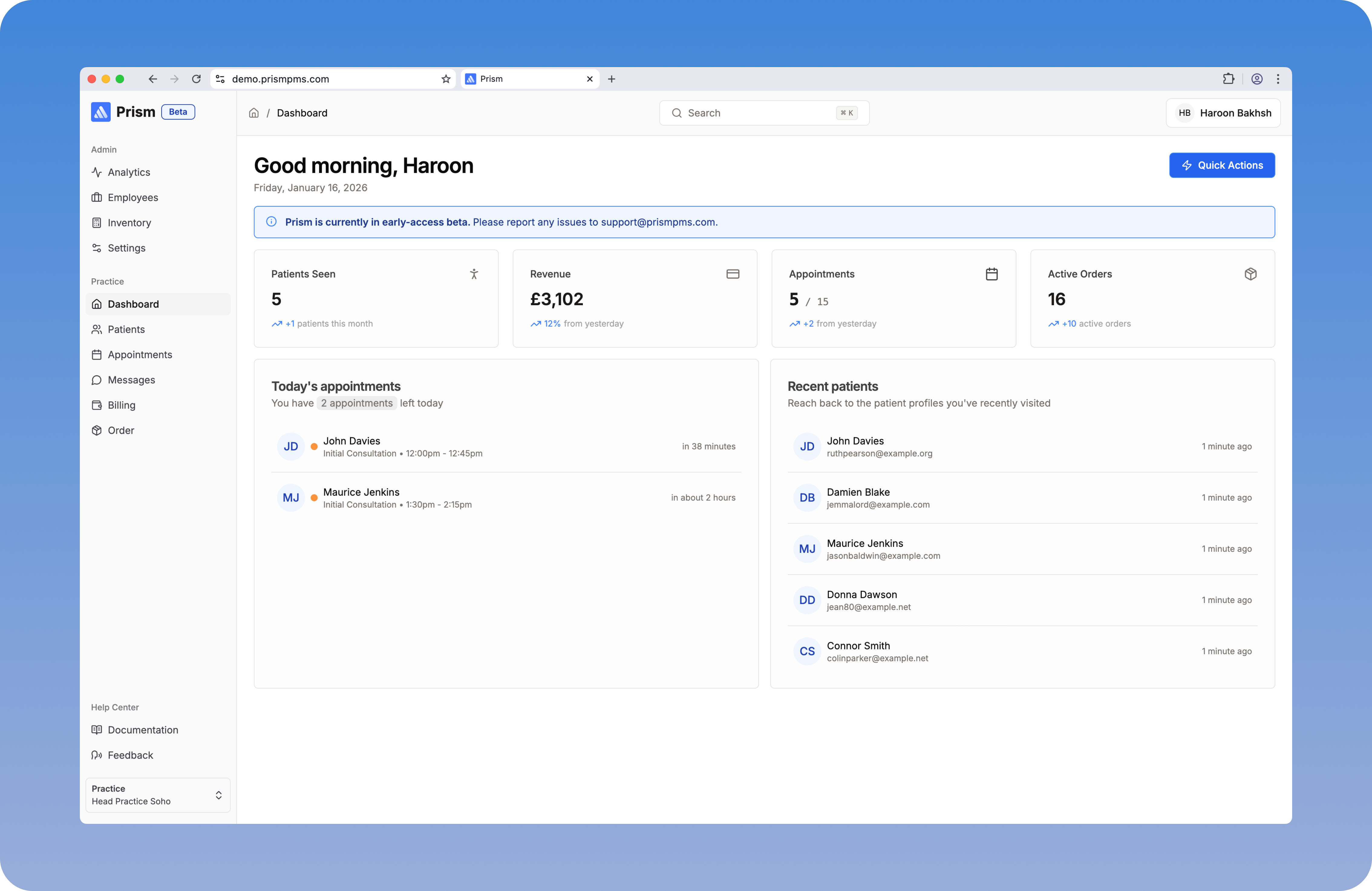 We're constantly shipping updates to make Prism the best platform for your practice. All new features are included in your monthly subscription at no extra cost.